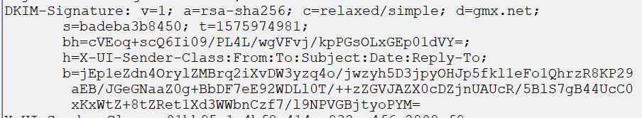 Alternativ können Sie sich selbst eine E-Mail senden und die Kopfzeile inspizieren: In dieser finden Sie den Eintrag „DKIM-Signature“, insofern DKIM ordnungsgemäß eingerichtet ist: