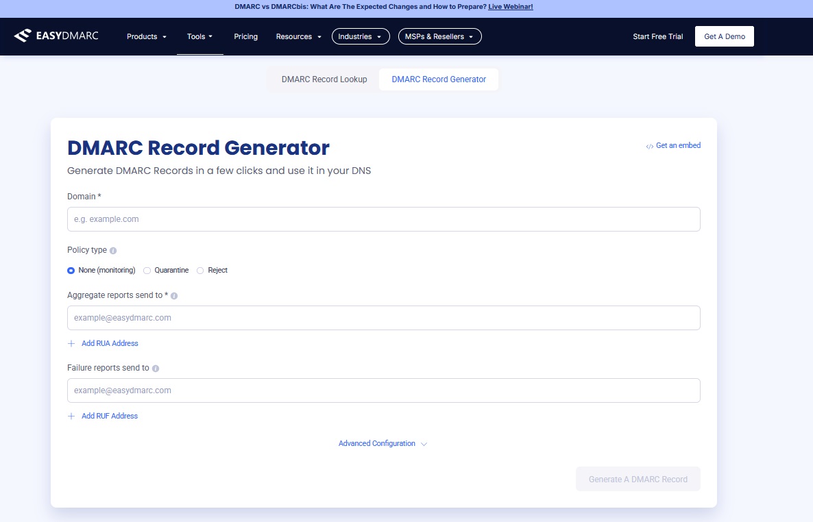 Nutzen Sie ein Online-Tool, z. B. den DMARC Record Generator von EasyDMARC. Dort geben Sie Ihre Domain sowie gewünschte Optionen ein (Policy, Reporting-Adressen etc.).