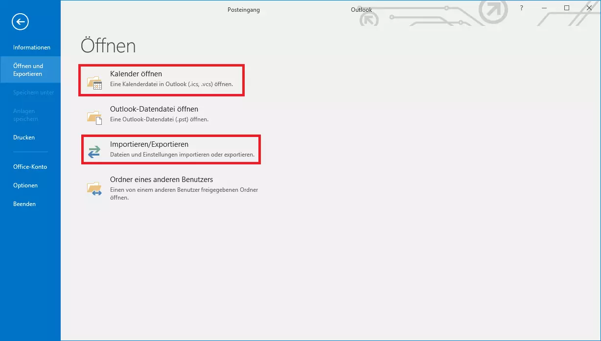 - Wählen Sie „Öffnen & Exportieren“ und dann „Kalender öffnen“.