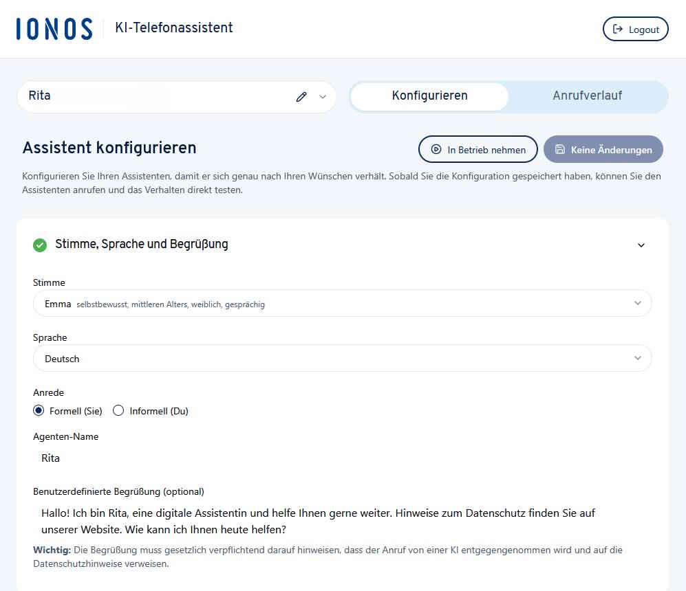 - Nachdem Sie den KI-Telefonassistenten im IONOS-Dashboard aktiviert haben, verbinden Sie Ihre Website und Ihre Rufnummer mit dem System.