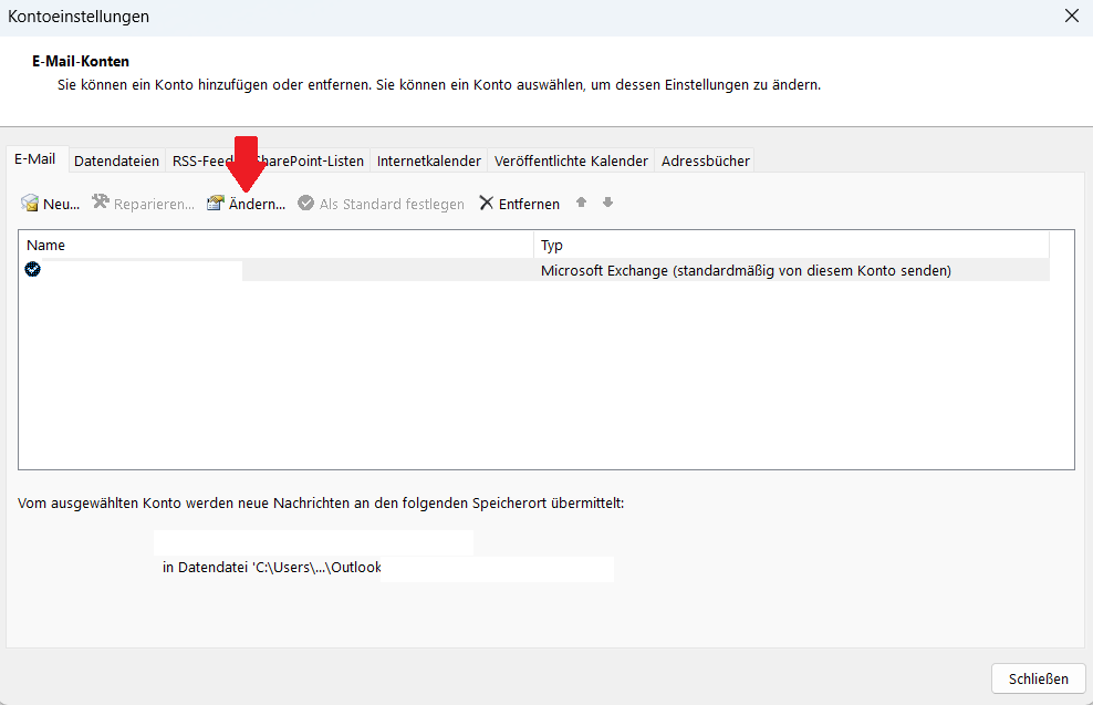 Markieren Sie das zu ändernde E-Mail-Konto (im Bild ist es das Standardkonto mit dem Häkchen davor) und klicken Sie auf „Ändern…“.