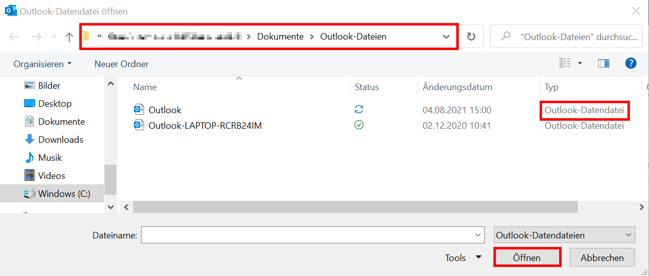- PST-Datei auswählen und auf „Öffnen“ klicken