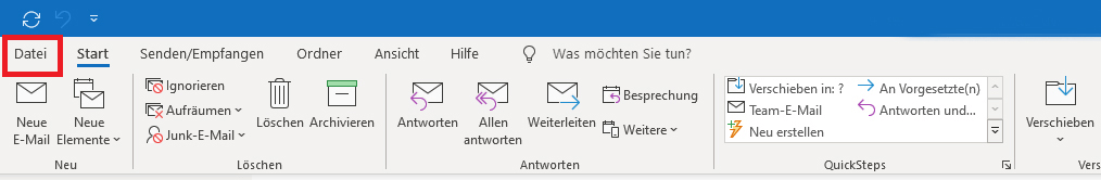 Schritt 1: Öffnen Sie Microsoft Outlook und rufen die Registerkarte „Datei“ auf: