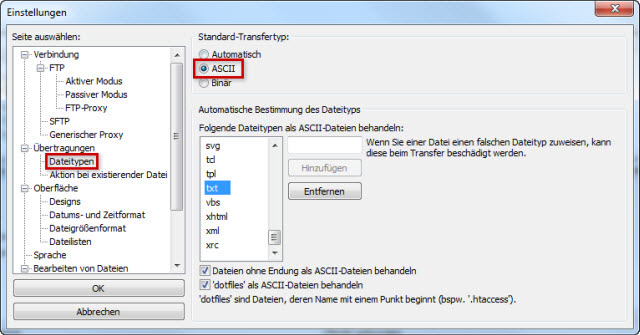 - Rufen Sie dort über Bearbeiten > Einstellungen die Einstellungen auf und stellen Sie hier im Unterpunkt Übertragungen > Dateitypen als Standard-Transfertyp ASCII ein. Der Dateityp txt ist bei den Dateitypen bereits voreingestellt.