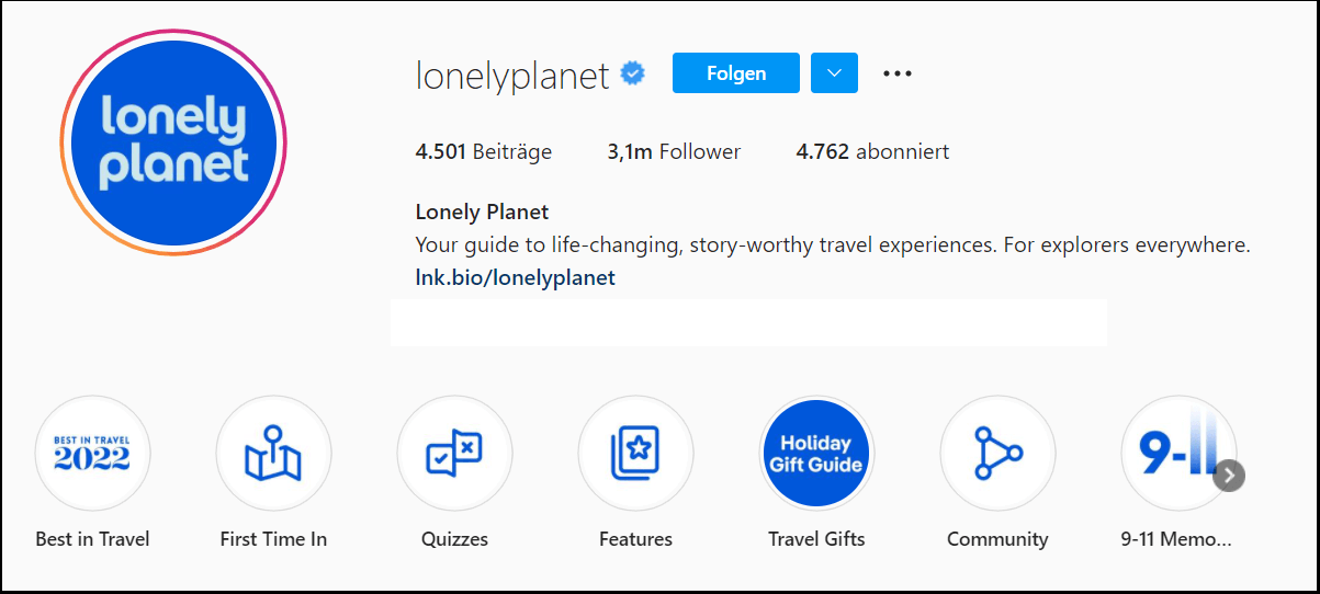 Ideal ist die Instagram-Bio, um Besuchern die eigene Mission zu erklären. Der Steckbrief des Reiseverlags Lonely Planet fasst Unternehmensphilosophie und Leistungen in zwei Sätzen zusammen. Auch Story-Highlights für Ausblicke, FAQs und Community-Building werden optimal verwendet.