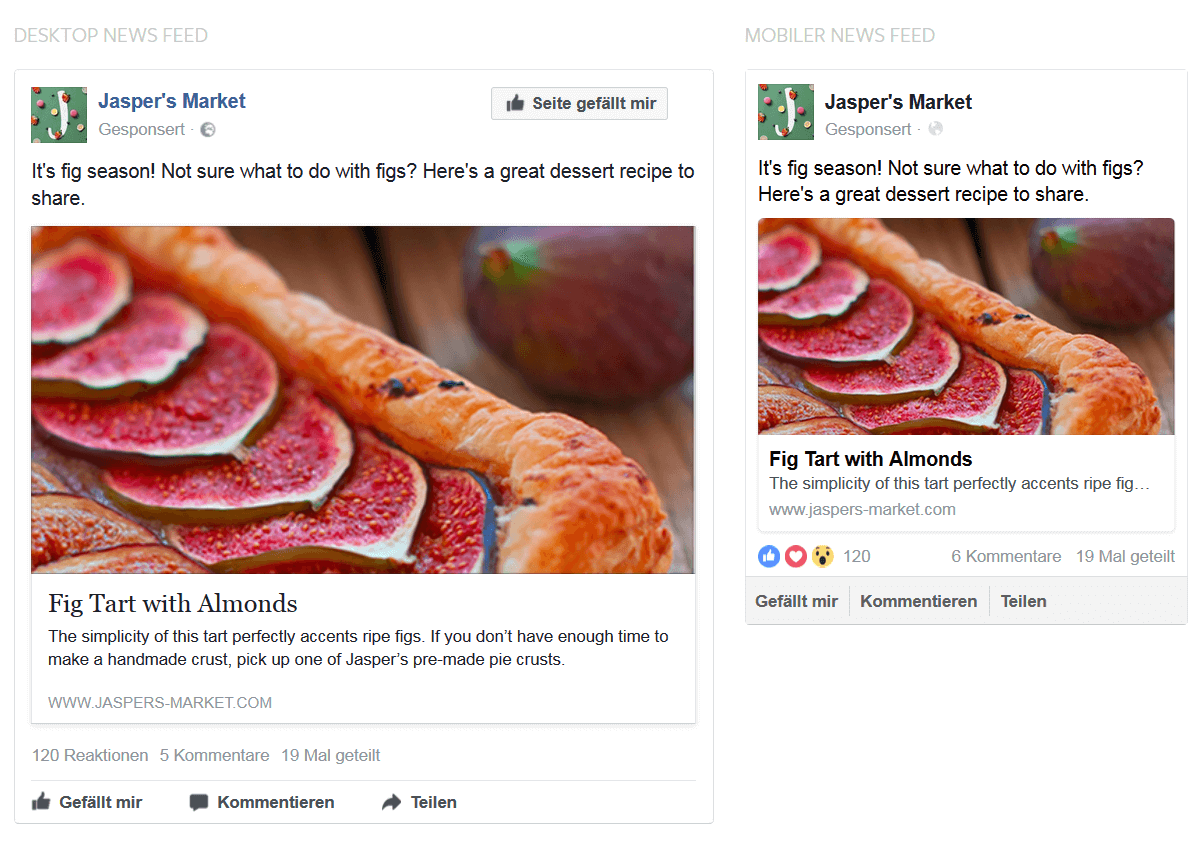 Da die mobile Nutzung von Facebook stark zugenommen hat und inzwischen mehr Zugriffe von Mobilgeräten als über den Desktop erfolgen, sollten Sie die Anzeigen im News-Feed auf jeden Fall in Betracht ziehen. Wie eine Facebook Ad bei den Nutzern dargestellt wird, ist dabei stets auch davon abhängig, ob sie in der Desktop- oder Mobilansicht ausgespielt wird – bei letzterer sind die Inhalte komprimierter.