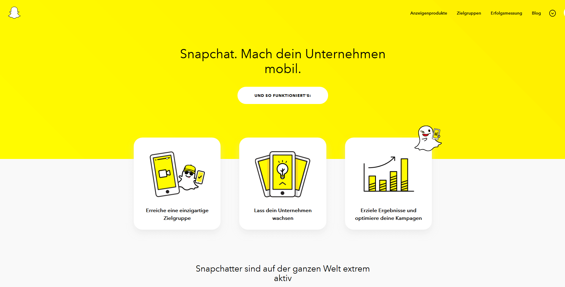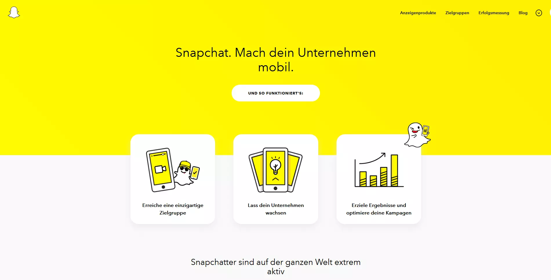 | Snapchat | 5 Millionen DAU | 14–24 Jahre | Lifestyle, Entertainment, schnelldrehende Produkte | 2 | Werbemittel immer im Vollbildmodus, erhalten so größtmögliche Aufmerksamkeit | Bietet sich oft nur für Werbetreibende mit einer vorrangig jungen Zielgruppe an |