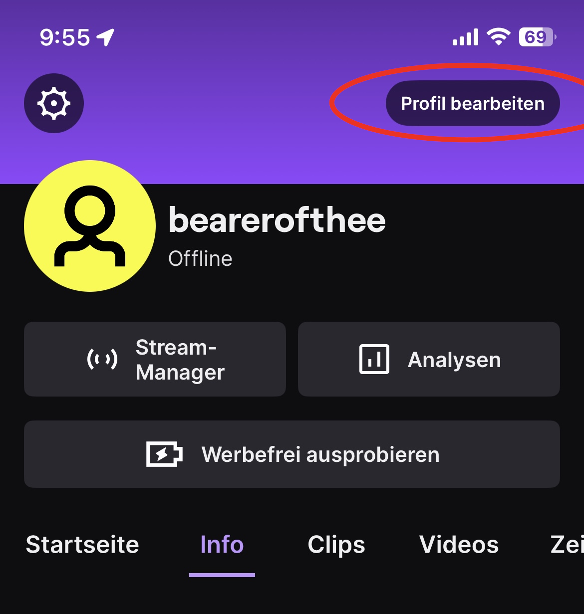 - Gehen Sie in Ihrer Twitch-App unten rechts auf Ihr Profilbild und dann oben rechts auf „Profil bearbeiten“.