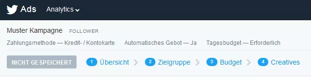 Möchte man Anzeigen auf Twitter schalten, stehen einem die oben genannten Kampagnentypen zu Auswahl. Die Kampagnentypen sind nach den Zielen der Kampagne benannt. Ist ein Kampagnentyp gewählt, leitet Twitter anschließend immer in denselben vier Schritten durch den Entwurf der Kampagne:
