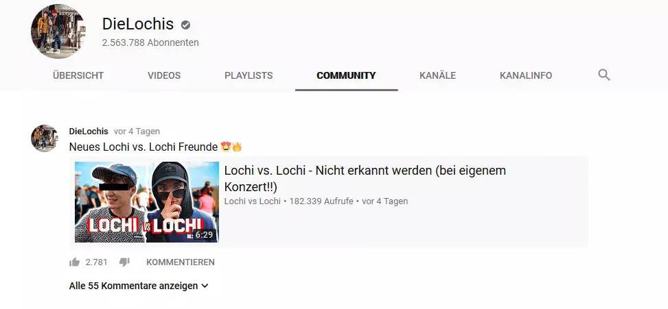 Das Musik- und Comedy-Duo „Die Lochis“ verwenden die Community-Funktion auf Ihrem Kanal vor allem zur Veröffentlichung von Bildern, die auf zukünftige Videos hinweisen und potenzielle Zuschauer neugierig zu machen sollen.