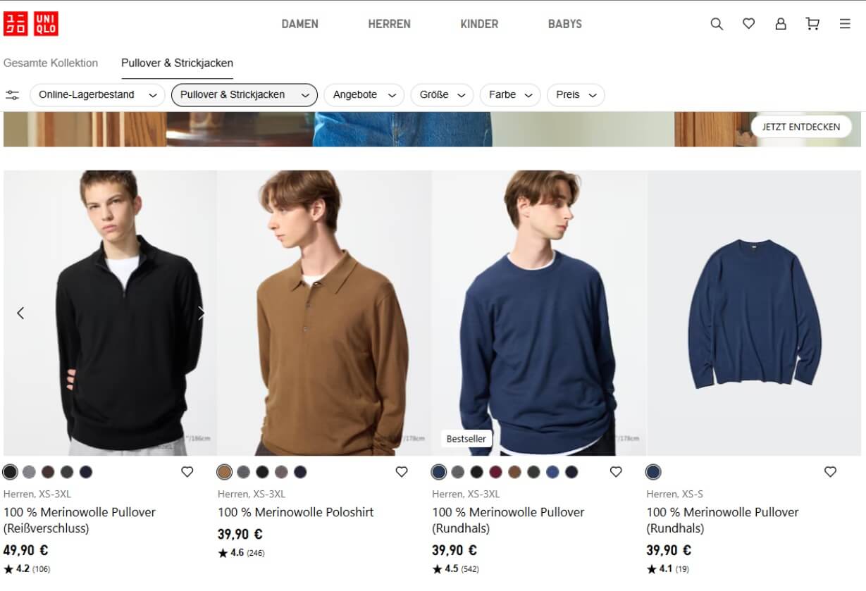 Viele Shops sorgen durch moderne Shop-Systeme inzwischen automatisch für mehr Interaktivität: Bewegt man die Maus über das Bild (Mouseover), lassen sich oft weitere Ansichten durchblättern oder alternative Farben anzeigen, ohne die Seite verlassen zu müssen. Das macht die Produktrecherche deutlich schneller und nutzerfreundlicher.