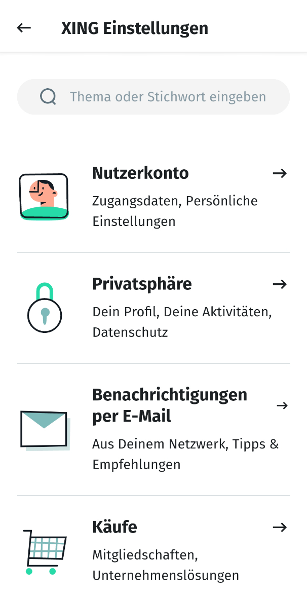 - Wählen Sie „Einstellungen“ (bzw. „Xing-Einstellungen“ in der App).