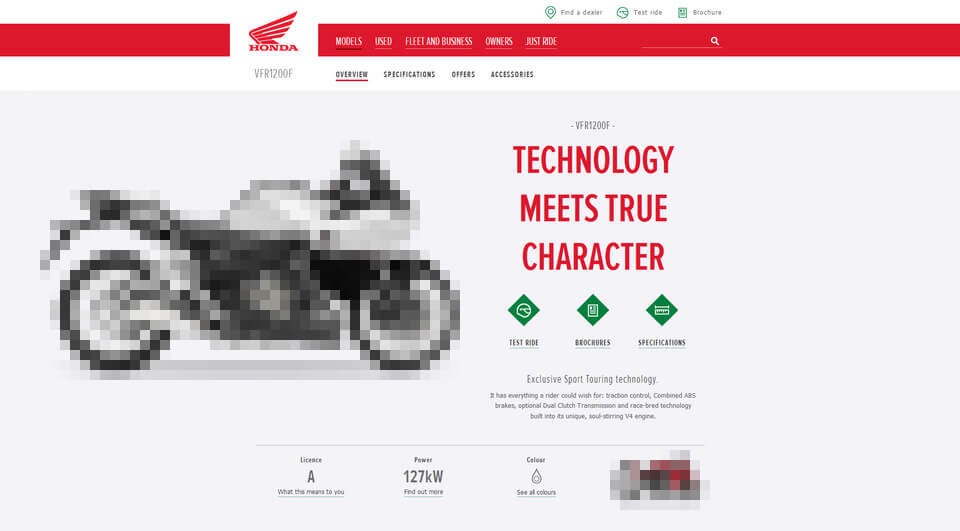 In diesem Fall wurde ein technischer Trick verwendet, um das Problem zu umgehen. Der Claim „Technology meets true character“ wurde als Überschrift zweiter Ordnung (H2) ausgezeichnet. Die eigentliche H1 ist der graue Text „VFR1200F“ direkt über dem Claim. Vermutlich sollte so der SEO glücklich gemacht werden, weil ja etwas Sinnvolles in der Überschrift steht. Ich, als SEO, bin aber nicht glücklich, weil die Nutzerführung nicht gut ist.