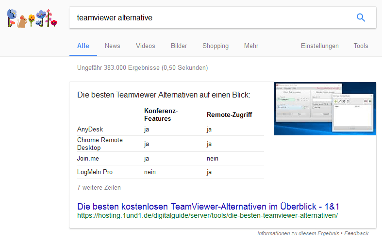 Diese Entwicklung sieht man sehr deutlich auf den Suchergebnisseiten (SERPs). Schon jetzt enthalten 15% der SERPs Featured Snippets und sogar 40% enthalten Knowledge Panels. Featured Snippets stellen dabei ein einzelnes Suchergebnis besonders prominent mit längerem Textausschnitt und sogar mit Bild dar. Oft werden auch Listen oder Tabellen eingebunden.