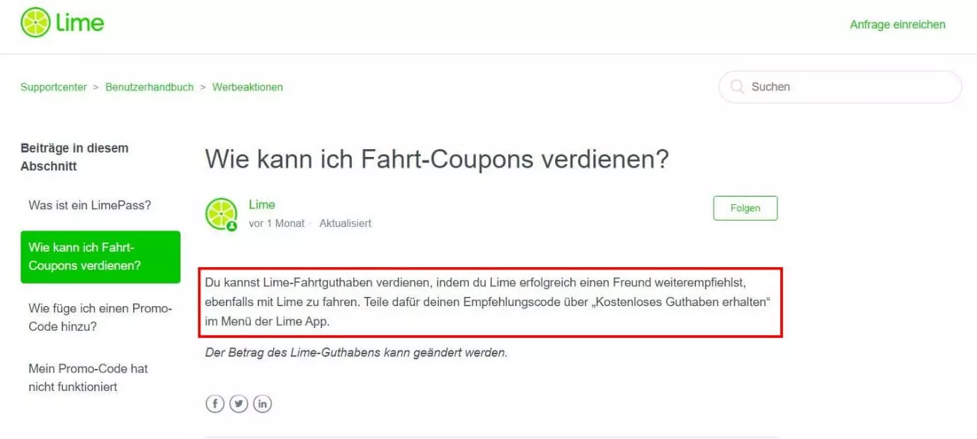 Der E-Scooter-Verleih Lime vergibt kostenloses Fahrtguthaben an Kunden, die einen persönlichen Empfehlungscode teilen. Wenn Freunde daraufhin ebenfalls das Service nutzen, erhält der Kunde das kostenlose Guthaben für Freifahrten gutgeschrieben. Auf der Website ist diese Information jedoch schwer zu finden.