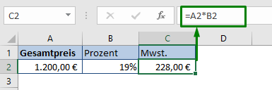 Im Beispiel steht der Gesamtpreis in Zelle A2 und der Prozentsatz in Zelle B2. Der absolute Wert der Mehrwertsteuer soll in Zelle C2 berechnet werden. Die passende Formel lautet: