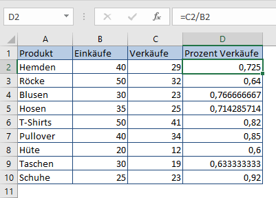 Sehen wir uns ein praktisches Beispiel der Excel-Prozentrechnung an: Ein Einzelhändler verwendet zu Inventarzwecken eine Tabelle mit eingekauften und verkauften Produkten. Die Anzahl der Produkte, die der Einzelhändler einkauft, steht in Spalte B und die Anzahl der Produkte, die er weiterverkauft, in Spalte C. Um in Spalte D der Excel-Tabelle den prozentualen Anteil zu berechnen, geben Sie in das erste Feld der Spalte (D2) folgende Formel ein: