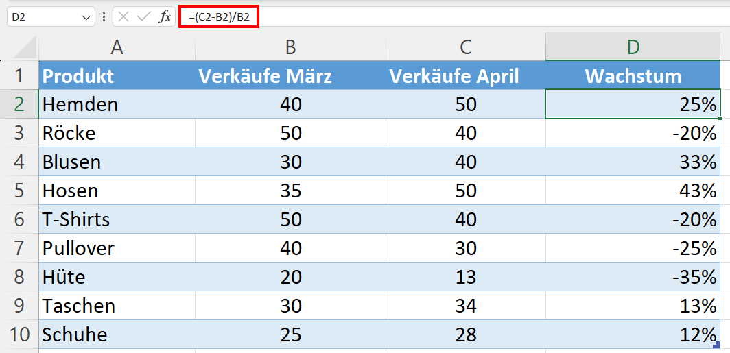 Der Einzelhändler aus unserem Beispiel hat die Verkäufe aus dem März in Spalte B eingetragen und die Verkäufe aus dem April in Spalte C. In Spalte D gibt er nun folgende Formel zur Berechnung des prozentualen Wachstums ein: