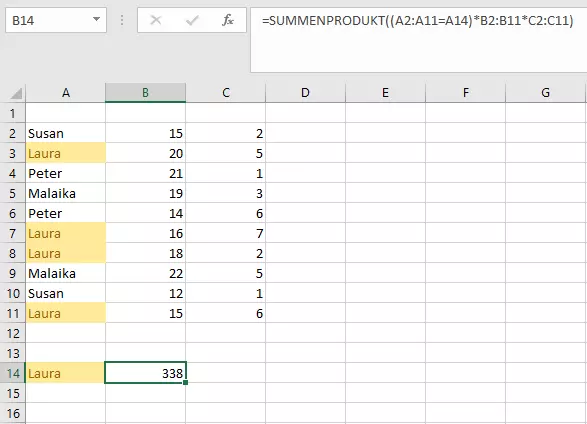=SUMMENPRODUKT((A2:A11=A14)*B2:B11*C2:C11)In das erste Argument haben wir also einen Vergleich eingefügt. Nur wenn die Angaben dem Wert in Zelle A14 entsprechen, werden die zugehörigen Zellen miteinander multipliziert und in die Summe aufgenommen. Neben dem Gleichheitszeichen, das den Vergleich durchführt, sind Multiplikationszeichen hinzugekommen. In der normalen Syntax können die Bereiche einfach mit einem Semikolon abgetrennt werden. Excel versteht üblicherweise auch so, wie es mit den Angaben umzugehen hat. Wenn Sie allerdings den Vergleich einbauen, fordert die Funktion die klare Auszeichnung der Rechenoperation. Sonst kommt es zu einem Fehler.