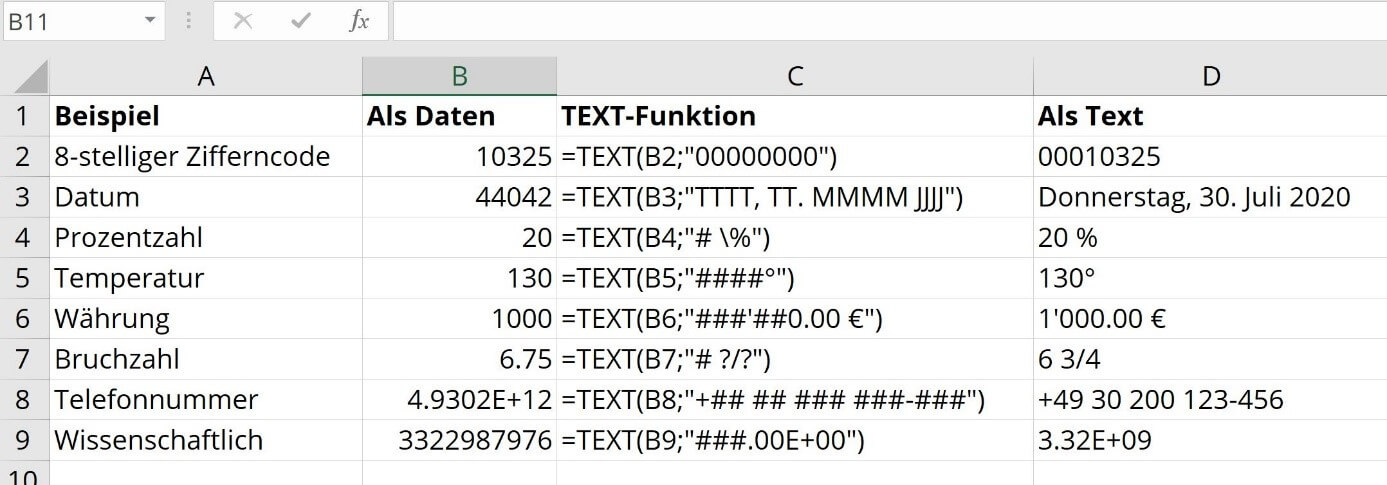=TEXT(Wert;Textformat)Die Excel-TEXT-Funktion erwartet zwei Parameter: