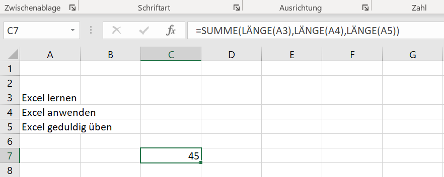 =SUMME(LÄNGE(A3);LÄNGE(A4);(LÄNGE(A5))Eine Übersicht über alle grundlegenden Excel-Funktionen finden Sie in unserem Artikel „Excel: Funktionen und Formeln im Überblick“.
