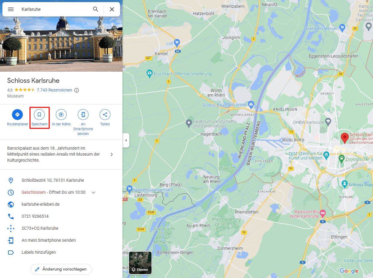 Schritt 2: Am markierten Punkt öffnen sich Informationen zum Ort sowie weitere Funktionsmöglichkeiten. Durch einen Klick auf „Speichern“ wird er Ihrer Liste von markierten Orten hinzugefügt.