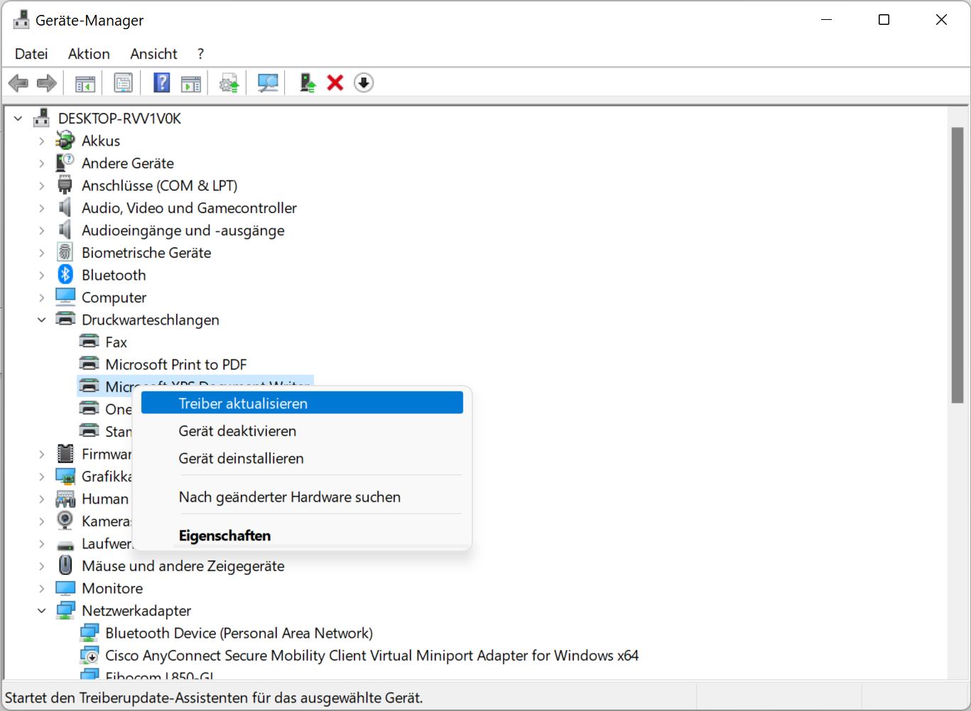 Um den Treiber Ihres Druckers zu aktualisieren, geben Sie in das Suchfeld Ihrer Taskleiste den Begriff „Geräte-Manager“ ein und wählen das passende Suchergebnis aus. Der Geräte-Manager öffnet sich. Erweitern Sie die Option „Druckwarteschlangen“ mit der linken Maustaste. Anschließend klicken Sie mit der rechten Maustaste auf Ihren Standarddrucker, um das Kontextmenü zu öffnen. Wählen Sie die Option „Treiber aktualisieren“ aus.