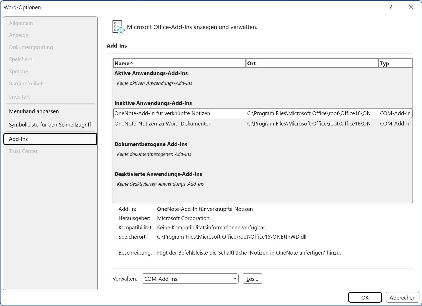 Wählen Sie im geöffneten Word-Dokument den Menüpunkt „Datei“ und anschließend „Optionen“ aus. Die Word-Optionen öffnen sich. Klicken Sie mit der linken Maustaste auf die Registerkarte „Add-Ins“. Anschließend wählen Sie im Drop-down-Menü „Verwalten“ die Option „COM-Add-Ins“ aus und klicken auf den Button „Los“.