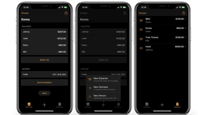 Gegenüber der Konkurrenz sticht Settle Up (Android und iOS) mit einem Bubble-Design hervor, das die einzelnen Personen der Gruppe mit individuellem „Kontostand“ zusammenfasst. Darunter finden sich die Timeline der einzelnen Abrechnungen sowie die nötigen Vorgänge, um Schulden zu begleichen. Mit der App können Sie ebenso Kosten teilen und gewichten wie zusammen mit einem Freund oder einer Freundin Bezahlvorgänge abschließen. Verwalten Sie als einzige Person die App, müssen Sie Ihre Freunde nicht zwingend zu Settle Up einladen. Sie können allerdings Ihre Gruppe via Link teilen.