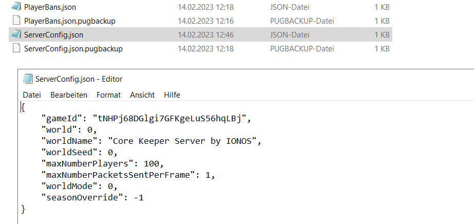 .\AppData\LocalLow\Pugstorm\Core Keeper\DedicatedServerÖffnen Sie das JSON-Dokument mit einem beliebigen Texteditor, um Ihre individuelle Konfiguration festzulegen. Hier können Sie folgende Einstellungen vornehmen: