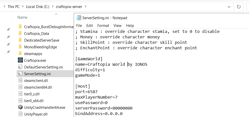 Die Einstellungen für Ihren Craftopia-Server nehmen Sie in der Datei ServerSetting.ini vor. Diese gibt es zwar standardmäßig nicht nach der Installation im festgelegten Verzeichnis – nach einem einfachen Start der Datei Craftopia.exe wird sie aber automatisch erzeugt.