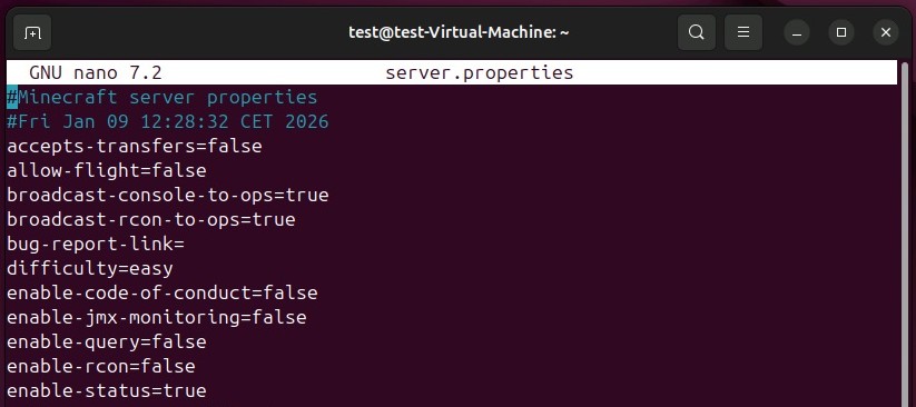 Sobald Sie dem Lizenzvertrag zugestimmt haben, können Sie sich der Konfigurationsdatei server.properties zuwenden. Diese wurde ebenfalls beim erstmaligen Start der Serveranwendung im aktuellen Verzeichnis erzeugt. Öffnen Sie die Datei mit dem Texteditor nano: