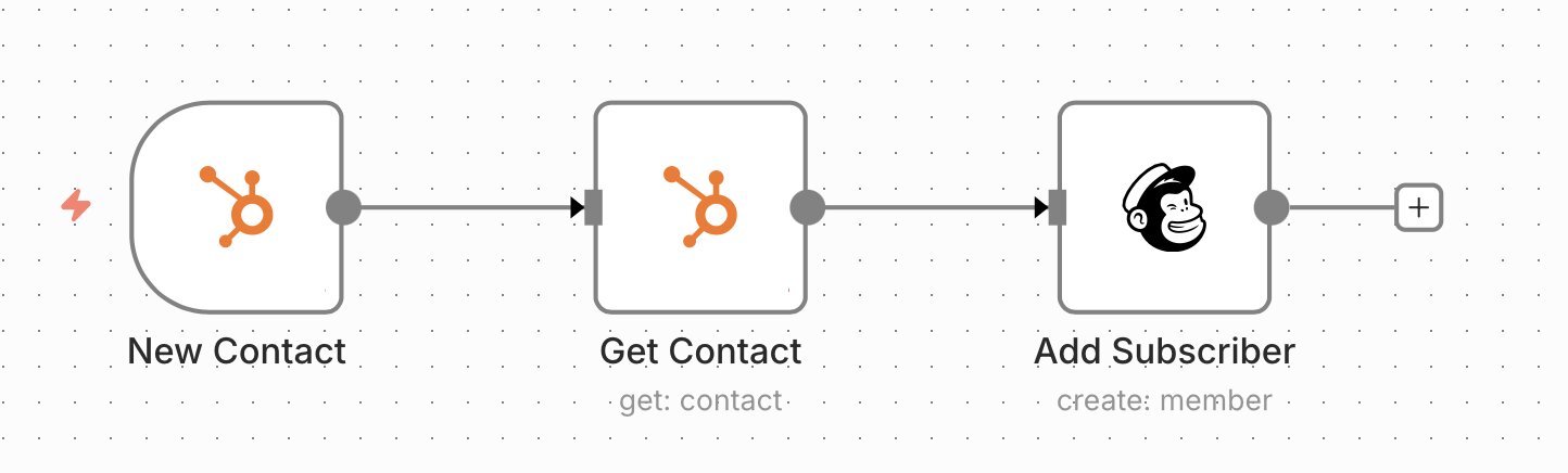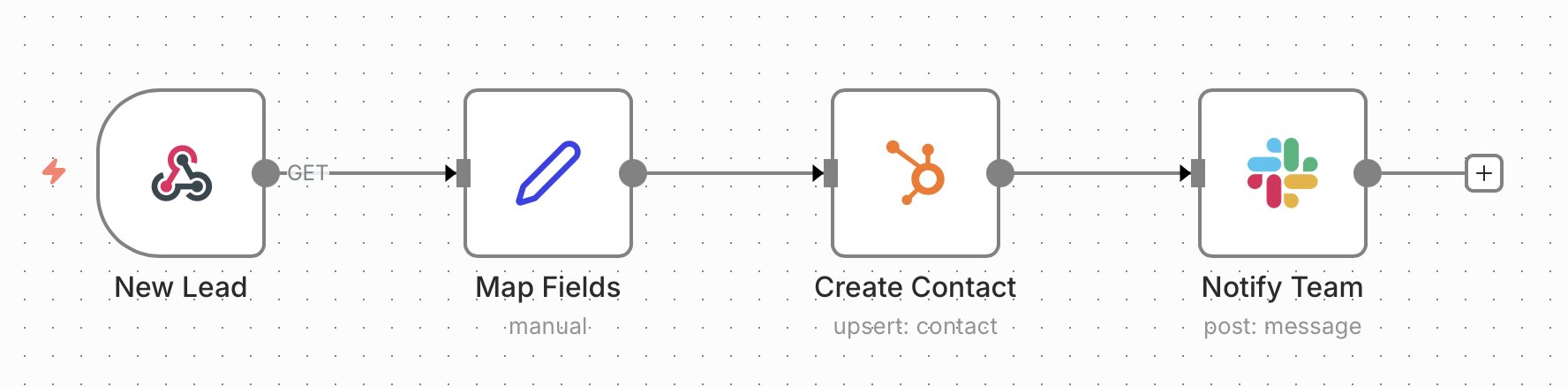 - CRM-Node zur Speicherung der Leads: Der CRM-Node (z. B. HubSpot) legt auf Basis der übergebenen Daten automatisch einen neuen Kontakt oder Lead an. Optional können Sie prüfen, ob der Kontakt bereits existiert, um doppelte Einträge zu vermeiden.