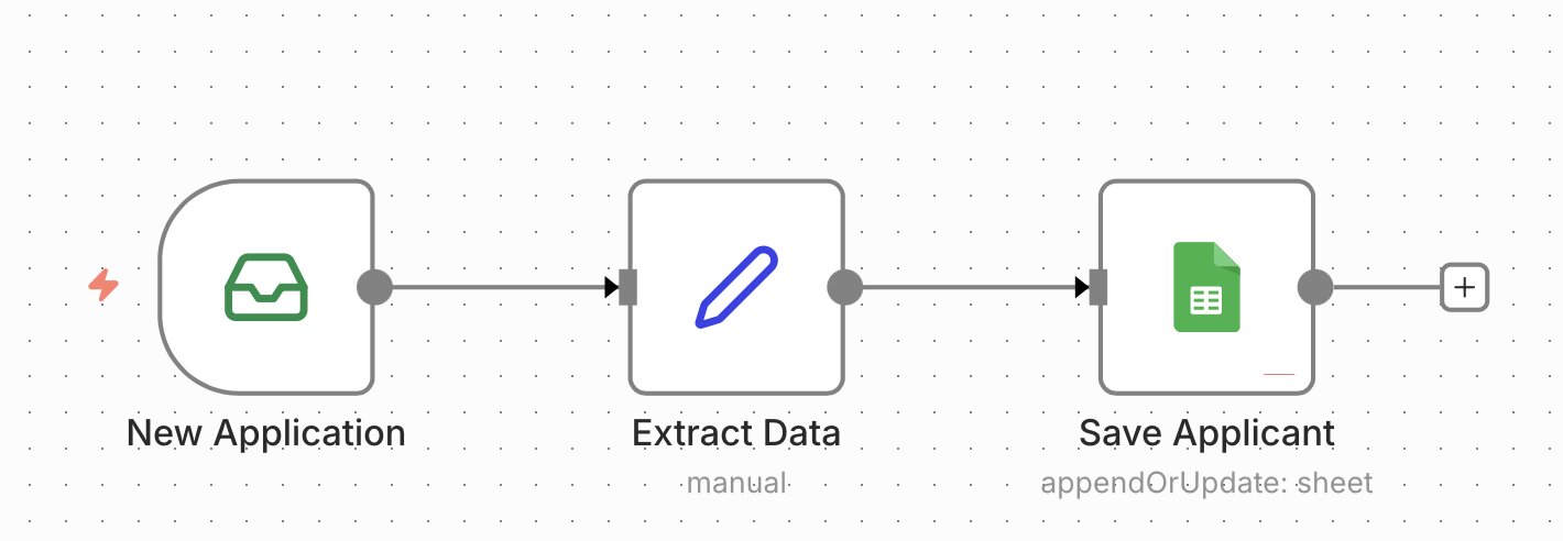 - E-Mail-Node zum Abrufen neuer Bewerbungen: Der E-Mail-Node überwacht Ihr Postfach und erkennt automatisch neue eingehende Bewerbungen.