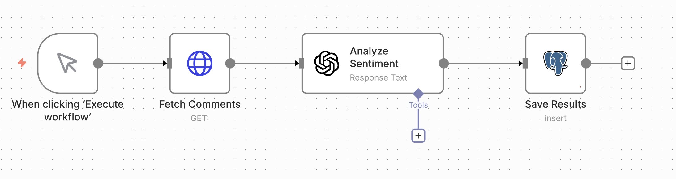 Mit diesem Workflow werden Kommentare aus Social-Media-Plattformen automatisch gesammelt und ausgewertet. Eine KI analysiert dabei die Inhalte und erkennt Stimmungen, Meinungen oder häufige Themen. Die Ergebnisse werden strukturiert gespeichert, sodass Sie Trends und Feedback Ihrer Community besser verstehen. Dadurch können Sie Ihre Inhalte gezielt optimieren und schneller auf Kritik oder positive Resonanz reagieren. Vor allem im Marketing und Community-Management ist dieser n8n-Workflow sehr wertvoll.