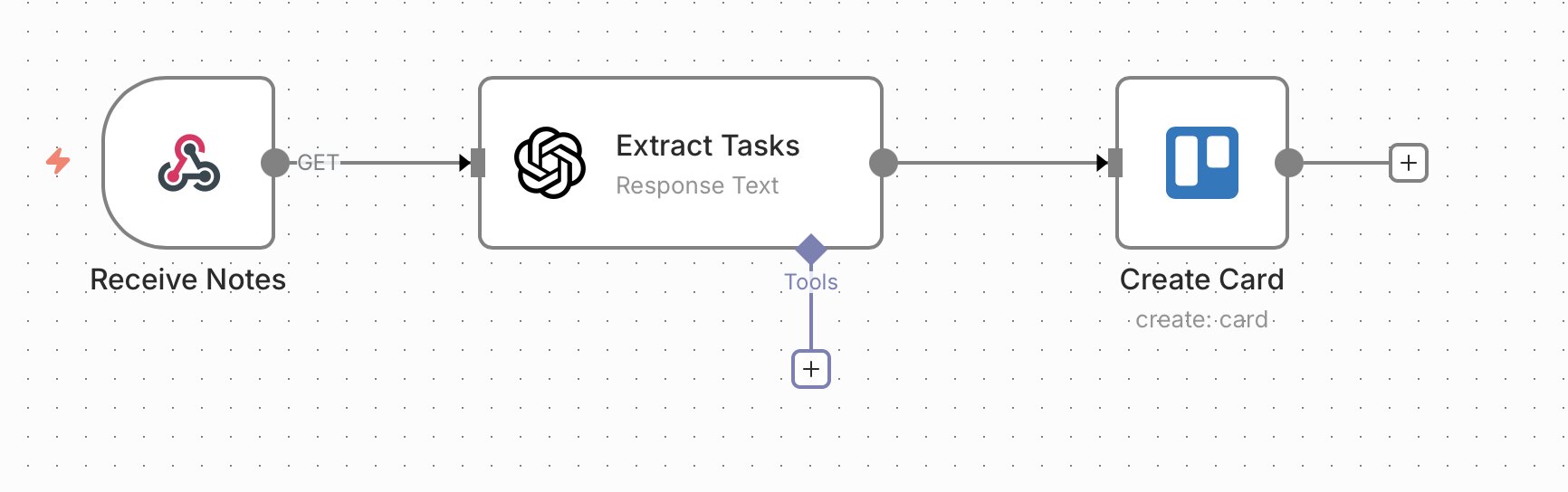 - Trello-Node zur Erstellung der Aufgaben: Der Trello-Node legt auf Basis der extrahierten Daten automatisch neue Karten in einem Board an. Dabei können Titel, Beschreibung, Fälligkeitsdatum und zuständige Personen direkt gesetzt werden.