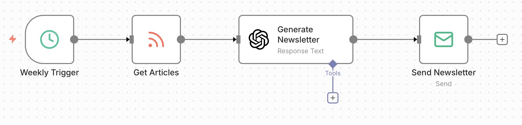 - Schedule-Node für die zeitgesteuerte Ausführung: Der Schedule-Node startet den Workflow automatisch in festgelegten Intervallen, zum Beispiel täglich oder wöchentlich. So wird der Newsletter regelmäßig erstellt.