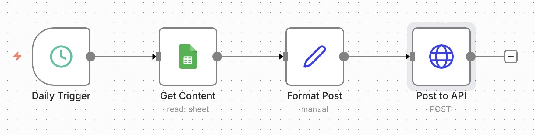 Mit diesem Workflow automatisieren Sie die Veröffentlichung von Beiträgen auf mehreren Plattformen gleichzeitig. Inhalte können zentral in einem Google Sheet oder einer Notion-Datenbank gepflegt werden. n8n ruft die Daten ab, formatiert sie und postet sie automatisch zu geplanten Zeiten. Das spart Zeit und sorgt für konsistente Inhalte. Zusätzlich können Sie Hashtags dynamisch generieren lassen. Auch Bild-Uploads lassen sich in diese n8n-Automation integrieren. Besonders für Marketing und Personal Branding ist dieser Workflow sehr hilfreich.