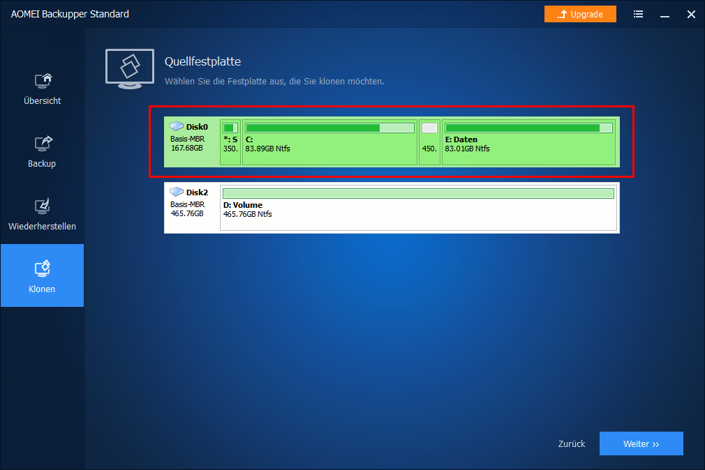 Nach einem Klick auf „Festplattenklon“ öffnet sich das Menü „Quellfestplatte“ mit einer Auflistung der angeschlossenen Festplatten. In diesem Menü wählen Sie den Datenträger aus, der kopiert werden soll. Nach einem Klick auf „Weiter“ muss die Zielfestplatte bestimmt werden: