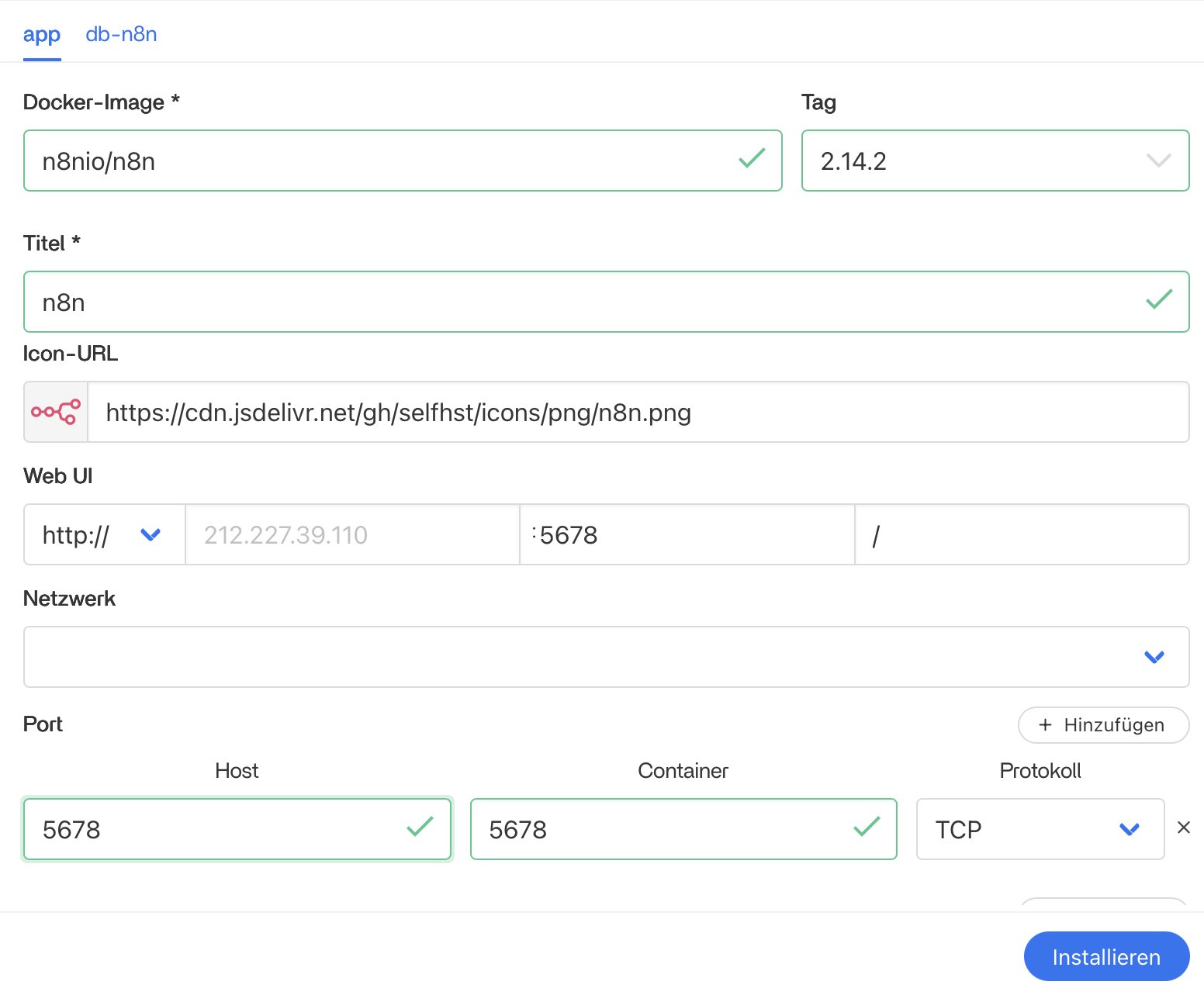 Für erste Tests ist diese Standardkonfiguration ausreichend. Für den produktiven Einsatz sollten Sie später zusätzliche Einstellungen wie eine Domain, HTTPS und korrekte Webhook-URLs konfigurieren (siehe Schritt 6).