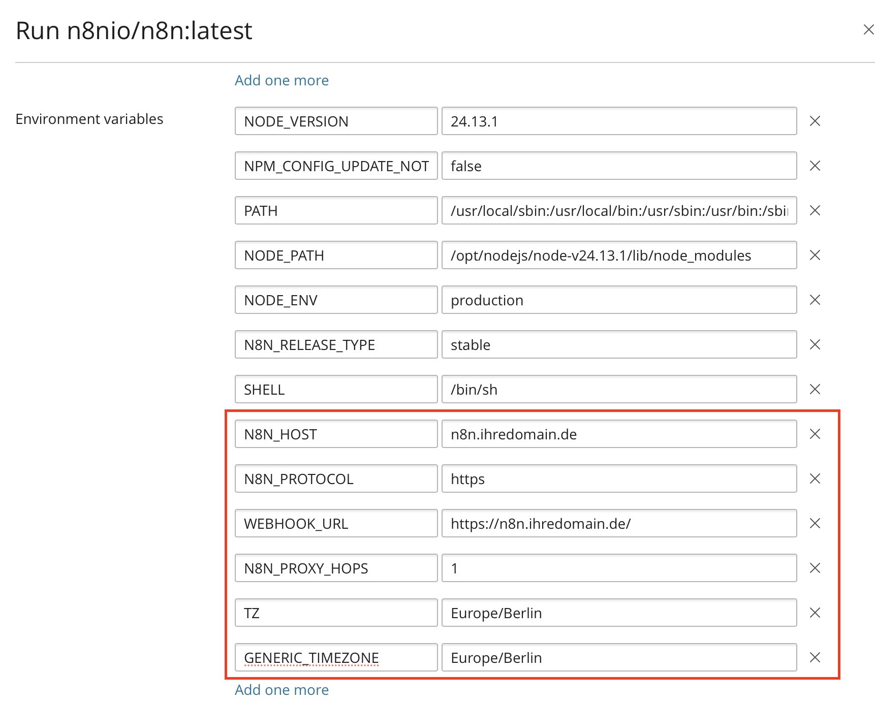 Angenommen, Ihre n8n-Instanz soll unter https://n8n.ihredomain.de erreichbar sein, können Sie sich an folgenden Werten orientieren: