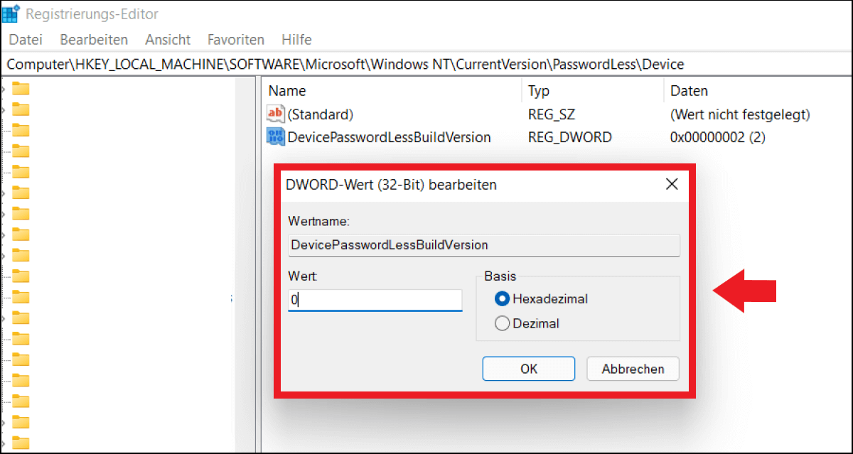 Schritt 3: Mit einem Doppelklick auf „DevicePasswordLessBuildVersion“ rufen Sie das zugehörige Menü auf. Setzen Sie hier den Wert von „2“ auf „0“.