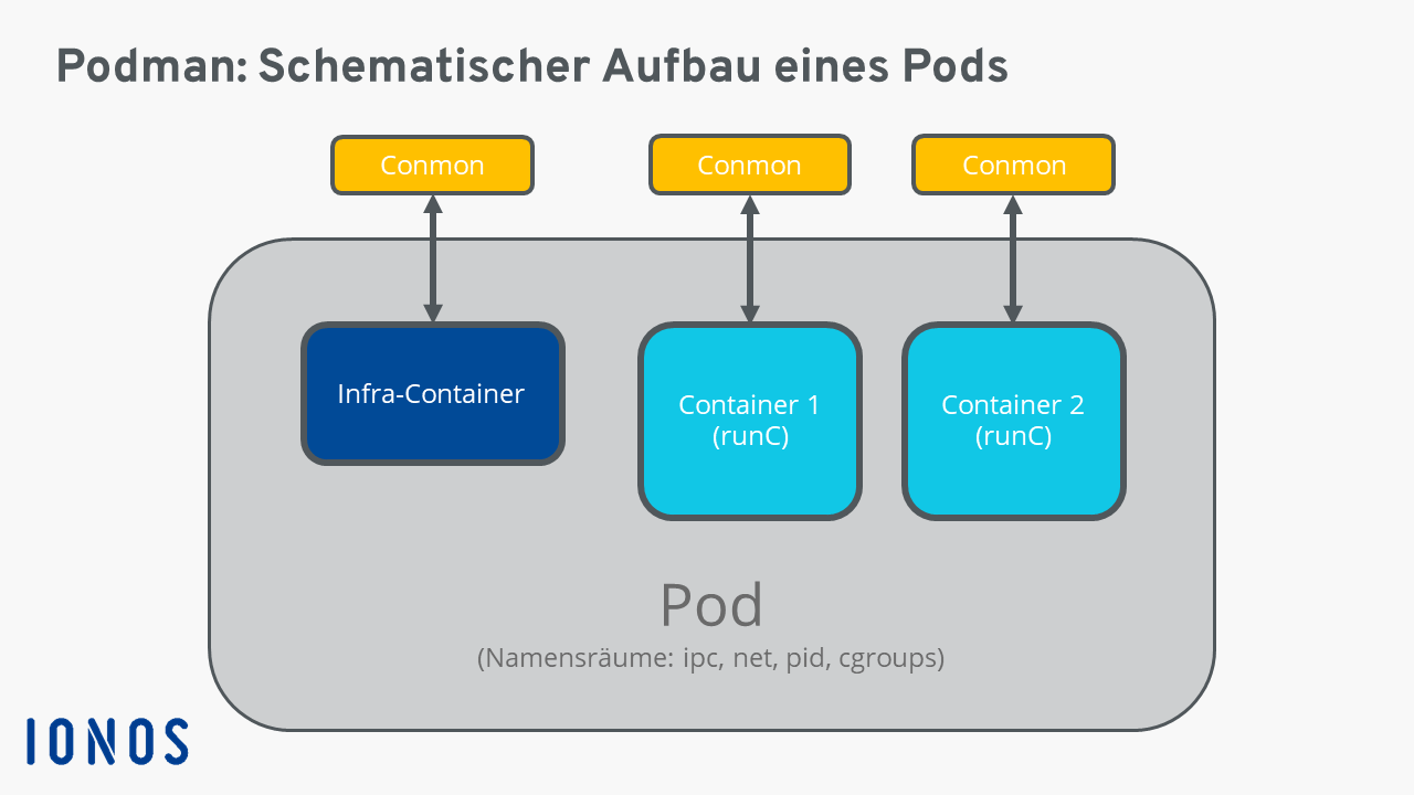 Den Kern eines Pods bilden sogenannte Infra-Container, die ausschließlich für die Funktionalität des Zusammenschlusses verantwortlich sind und zu diesem Zweck die einzelnen Ressourcen wie Namespaces, Netzwerk-Ports, CPU, Arbeitsspeicher etc. verwalten und gewährleisten. Ferner setzt Podman beim Pod-Management auf das in C geschriebene Monitoring-Tool Conmon, das die einzelnen virtualisierten Komponenten überwacht und beispielsweise Logs sichert. Zudem fungiert das Werkzeug als Schnittstelle zum Terminal des jeweiligen Containers. Als Laufzeit für die Container verwendet Podman die Software runC, die auch in vielen anderen Lösungen wie Docker oder rkt zum Einsatz kommt.