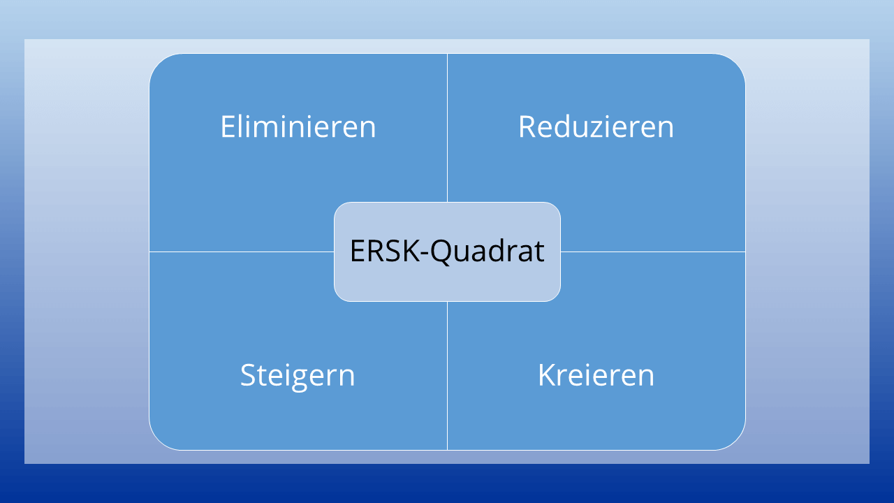 Nun geht es darum, die Erkenntnisse umzusetzen. Dabei wendet man das Werkzeug des ERSK-Quadrats (auch Vier-Aktionen-Modell genannt) an. Die Methode sieht vier Hebel vor, mit denen Sie das Produkt einstellen, um eine erfolgreiche Innovation zu entwickeln und einen neuen Markt zu schaffen: