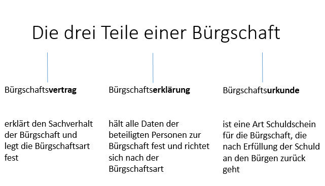 Eine vertraglich geregelte Bürgschaft besteht aus drei Teilen: dem Bürgschaftsvertrag, einer Bürgschaftserklärung und einer Bürgschaftsurkunde. Rechtskraft erlangt diese Verpflichtung für den Bürgen dabei durch die Bürgschaftserklärung.