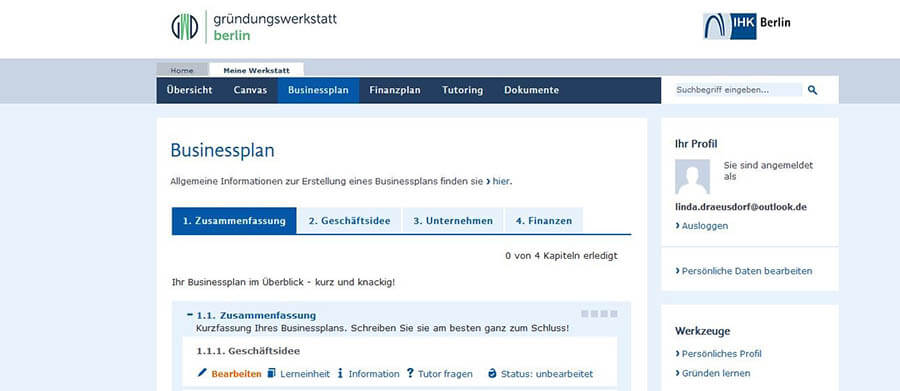 Die Onlineplattform Gründungswerkstatt Deutschland (GWD), die von über 30 regionalen Industrie- und Handelskammern (IHKs) in ganz Deutschland betreut wird, stellt Nutzern neben interessanten Informationen zur Unternehmensgründung auch eine Businessplan-Software gratis zur Verfügung. Um diese zu nutzen, geben Sie zunächst die Postleitzahl Ihres geplanten Gründungsstandorts an, um zum Bereich der zuständigen regionalen Kammer zu gelangen. Im Anschluss müssen Sie sich in dem Portal registrieren, wobei Sie u. a. eine Mailadresse, Ihren Vor- und Nachnamen sowie eine Telefonnummer angeben müssen. Nach der Aktivierung des angelegten Profils können Sie sich in Ihre „Werkstatt“ einloggen, wobei Ihnen automatisch ein Tutor als Ansprechpartner zugewiesen wird.