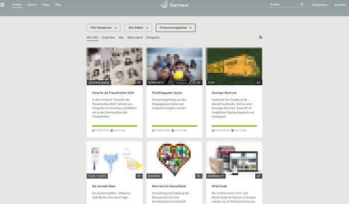 | Startnext | 2010 | Deutsch | 900.000 | Freiwillig | Reward-Based/Klassisches Crowdfunding („Alles oder nichts“-Prinzip) | Künstler, Erfinder, Start-ups, wohltätige und gemeinnützige Zwecke |