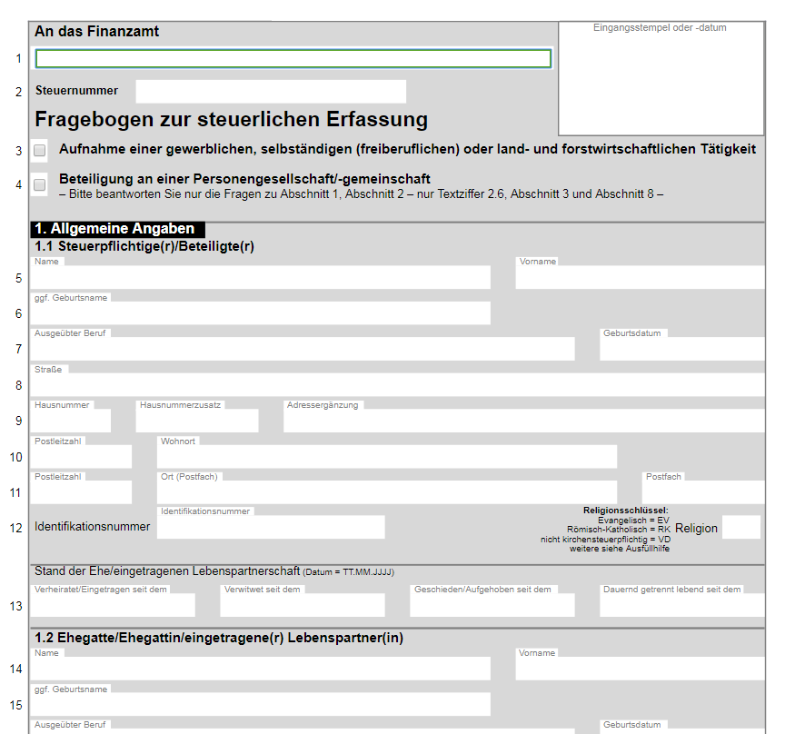 Ihre Steuernummer, die in Zeile 2 und auf allen folgenden Seiten des Fragebogens gefordert wird, erhalten Sie erst nach der Anmeldung beim Finanzamt (falls Sie noch keine haben). Sie können dieses Feld also ggf. frei lassen.