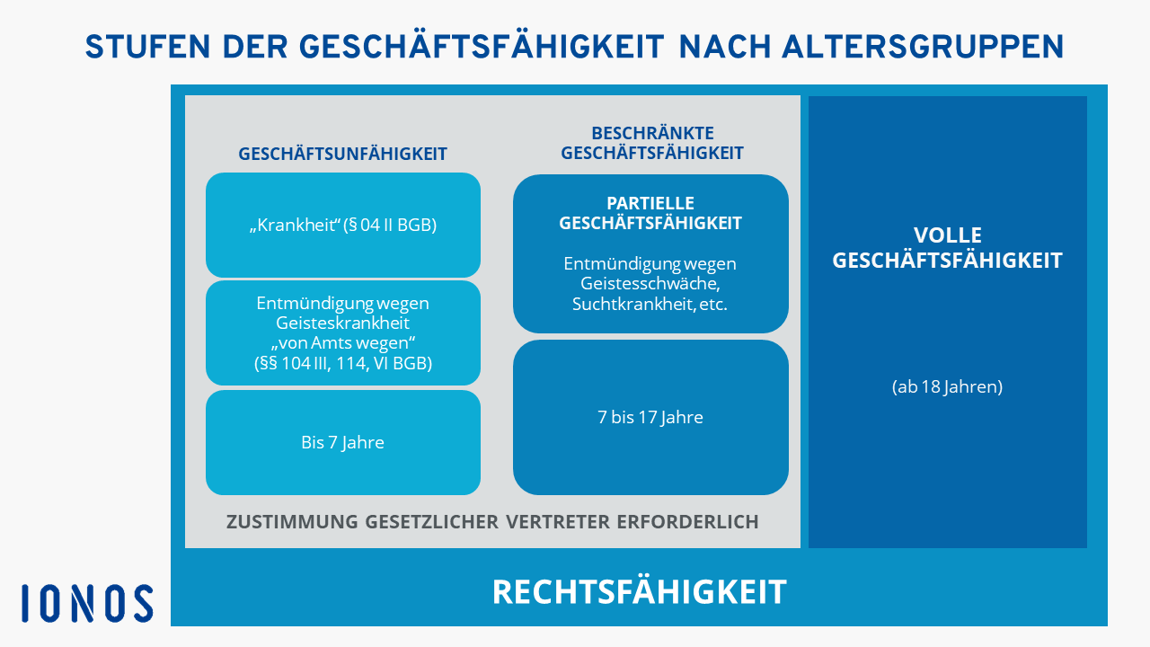Wie bereits erwähnt, sind alle natürlichen Personen ab ihrer Geburt rechtsfähig, jedoch wird nach dem BGB in vier verschiedene Stufen der Geschäftsfähigkeit, abhängig vom Alter und der geistigen Gesundheit, unterschieden: