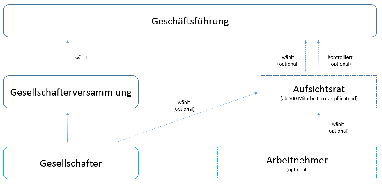 Optional kommt noch ein Aufsichtsrat hinzu. Obligatorisch ist er laut Drittelbeteiligungsgesetz, wenn die Gesellschaft in der Regel mehr als 500 Arbeitnehmer beschäftigt – und zwar unter Beteiligung der Arbeitnehmer (§ 1 Abs. 3 DrittelbG).